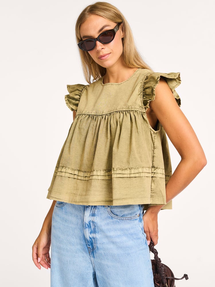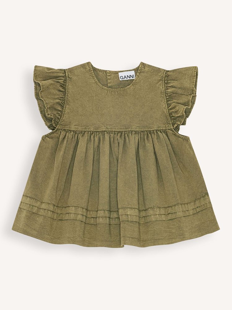 Ganni Washed Stretch Cotton Frill Sleeve Top | Orangebag